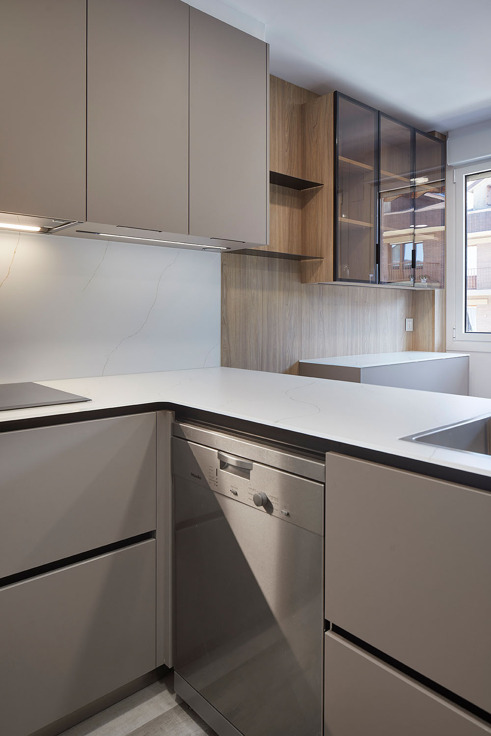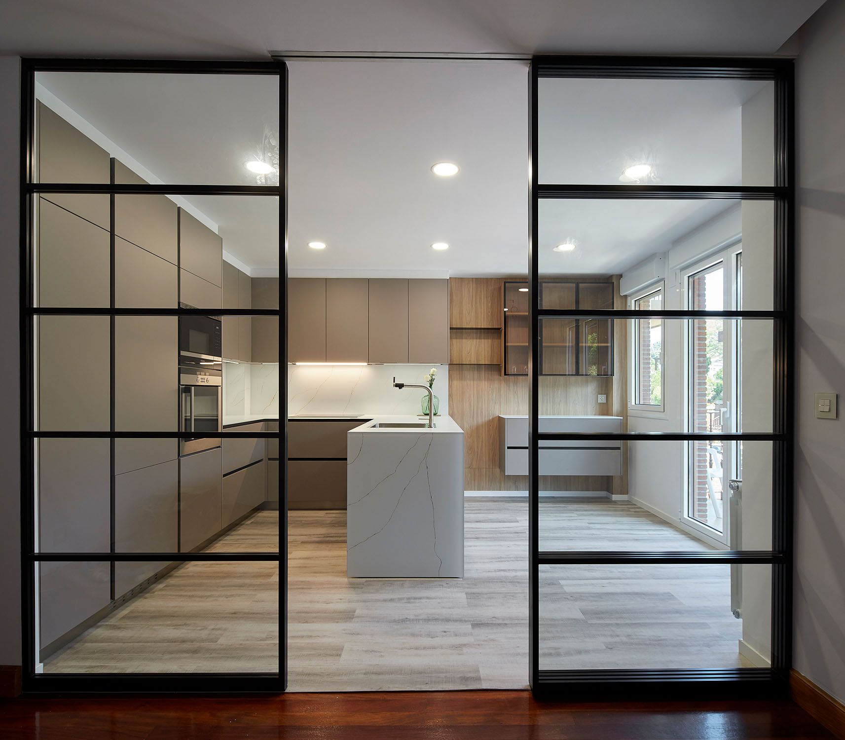 La reforma de cocina en Donostia combina a la perfección la calidez de la madera con la modernidad del cristal templado y los detalles en negro, creando un ambiente nítido, fluido, y muy acogedor.