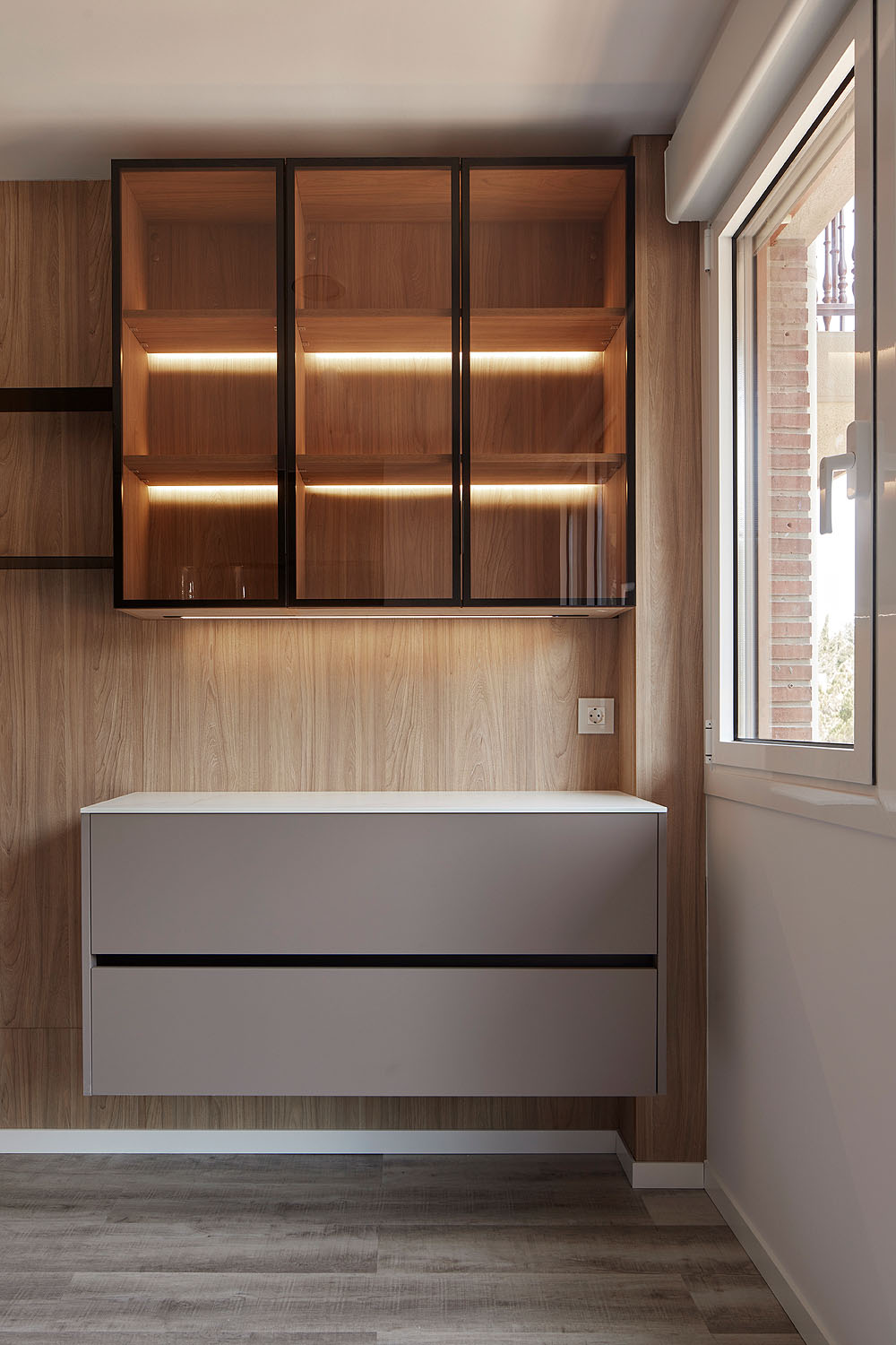 Módulos vitrina de bisagra oculta en acabado madera con luz indirecta en el interior