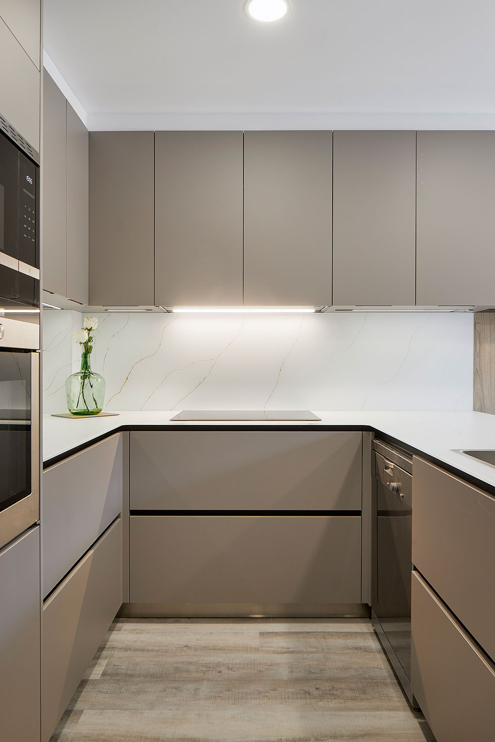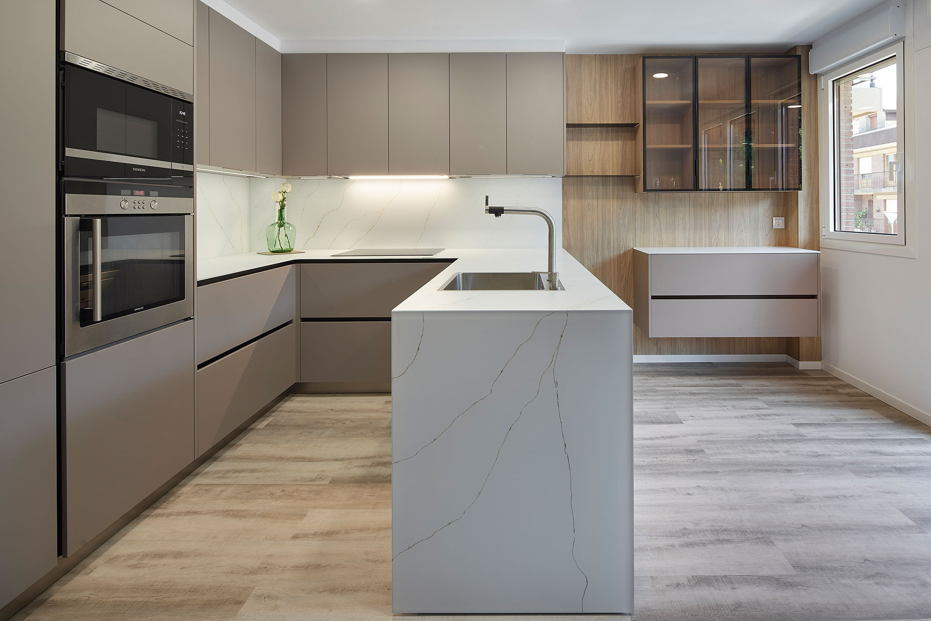 Más allá de su estética impecable, la cocina está diseñada para la máxima funcionalidad. La isla central con encimera de cristal templado Borghini se convierte en el punto de encuentro ideal, invitando a la conexión y a la celebración diaria.